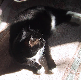Abby: I like to lay just like this between Momma's feet when she gets up really early in the morning to get ready for work. I scratch at her pant legs to get the material to lay just right because I am making a neat nest for myself. Then I lay my paws on top of Momma's feet and put my head down on my paws. Then I fall asleep. I don't know why she has got to move when I get all comfy. I think Momma's should have to stay home with all of us kitties, dont' you?