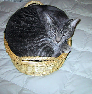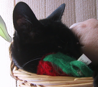 Abby curls up with her strawberry. Notice she has plenty of room. This is a very small basket.