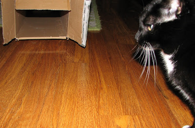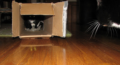 Mr. Jinx checks out one box while a little tuxie princess squeezes into another. Miss Boo keeps a cool eye out. Miss Boo says 'who is that in there?' Abby says "it's me!" to Boo. Miss Boo keeps a vigil.