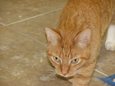 As you can see I am doing a real fine job of inspectin this job. (See me way in the back, Momma missed me the when she was takin this picture) Purrfect. I like it. I give dem beans two paws up on the workmanship so far...tomorrow this first phase will be finished and then we get noo cabinets! Momma is all excited!