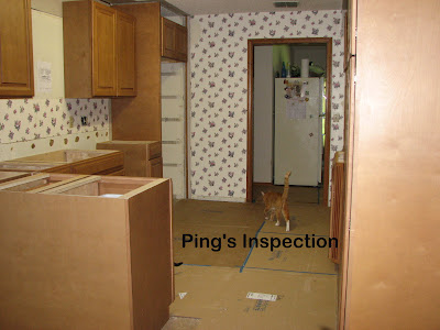 Abby strolls through checking out the cabinets. We now have two walls of cabinets! *wooHOOOOOOOO* Boo and Ping are making sure that everything is in it's right spot. Abby says she got her cabinet back...she scratched tested it for future use. Next step: Crown molding Arch over sink area and touch ups!