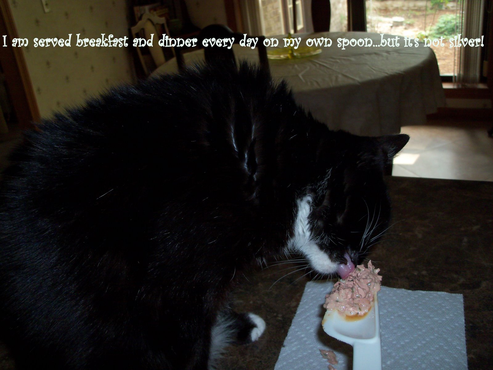 Abby you are a very good sweet kitty to try and help your mum clean up after meal times! And very clever to be eating from a very nice plastic spoon!