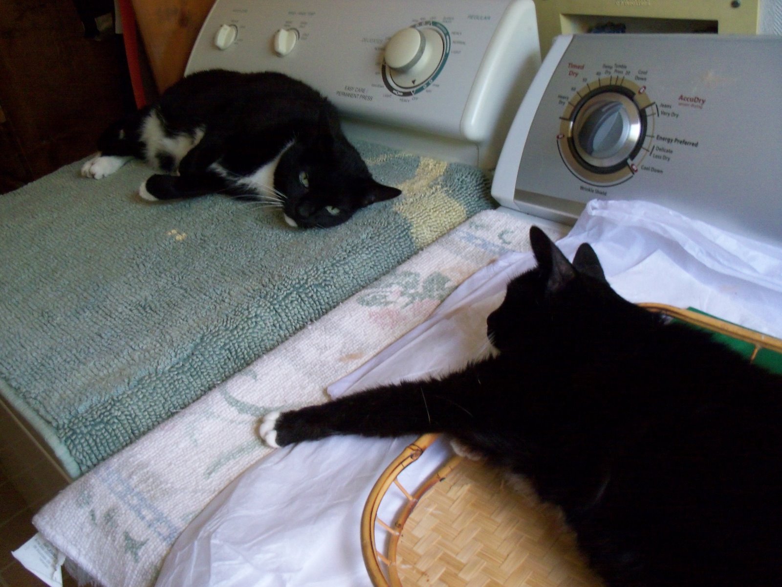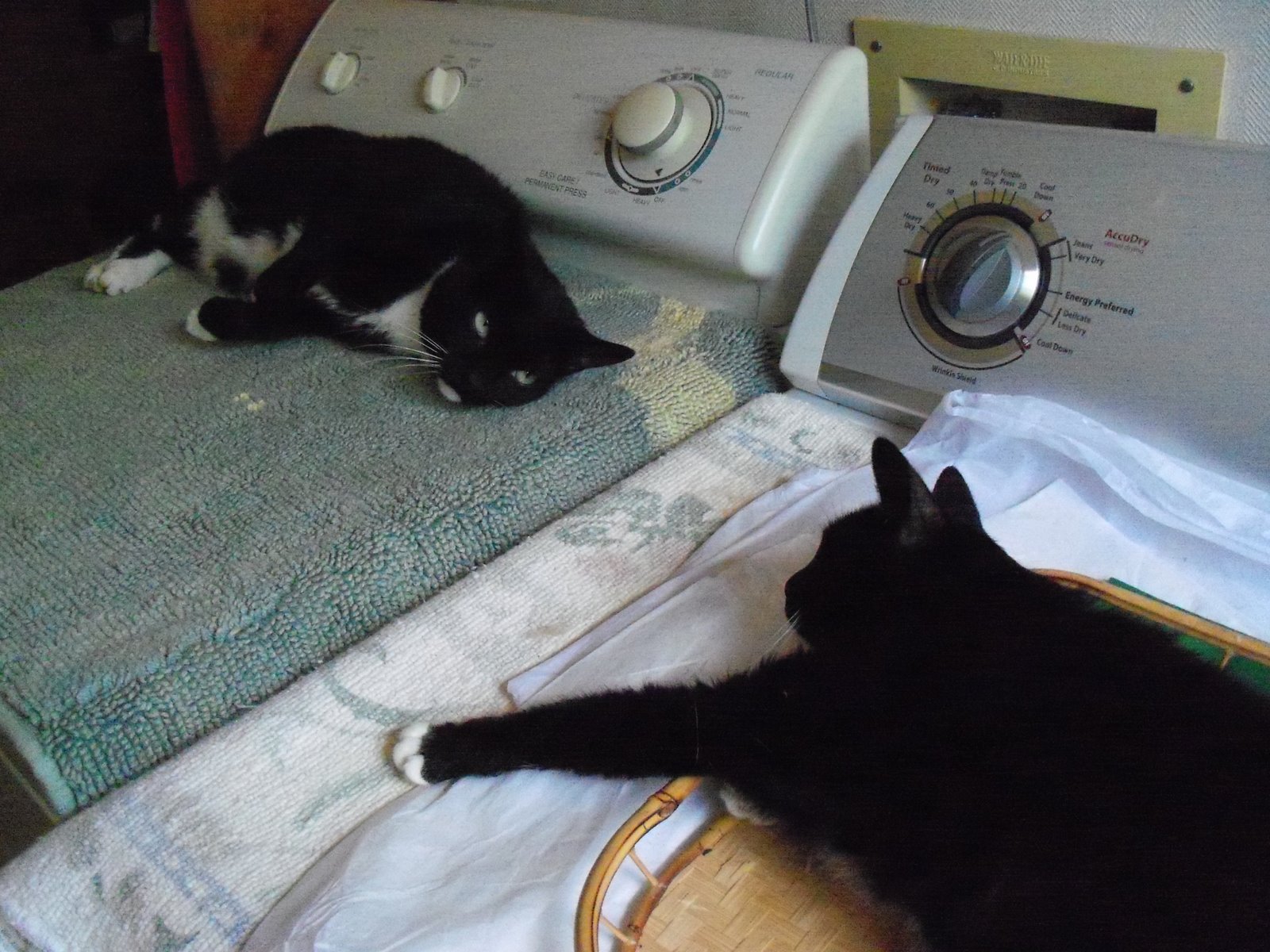 Is the tray on the washer more favorite than the towel on the dryer? Both look like comfy spots to me.