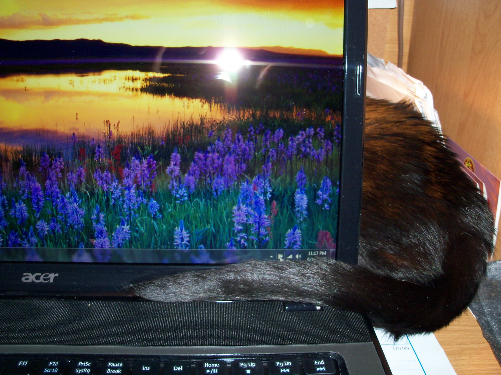 Boo what a wonderful place to meditate. We love how your chose to display your long, lovely tail. I bet it is nice and warm behind the laptop too..word of caution even though laptops are mouseless, I suggest you be on the look out they are sneaky rodents!!! Madi and Mom