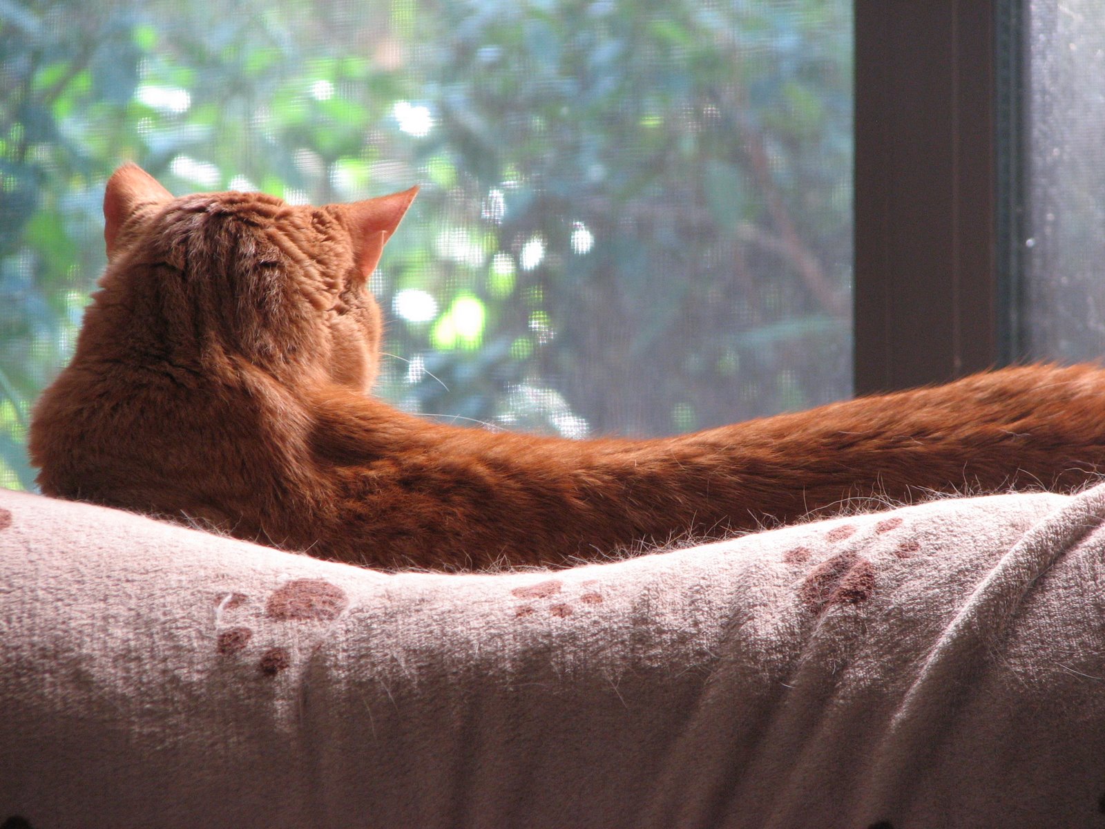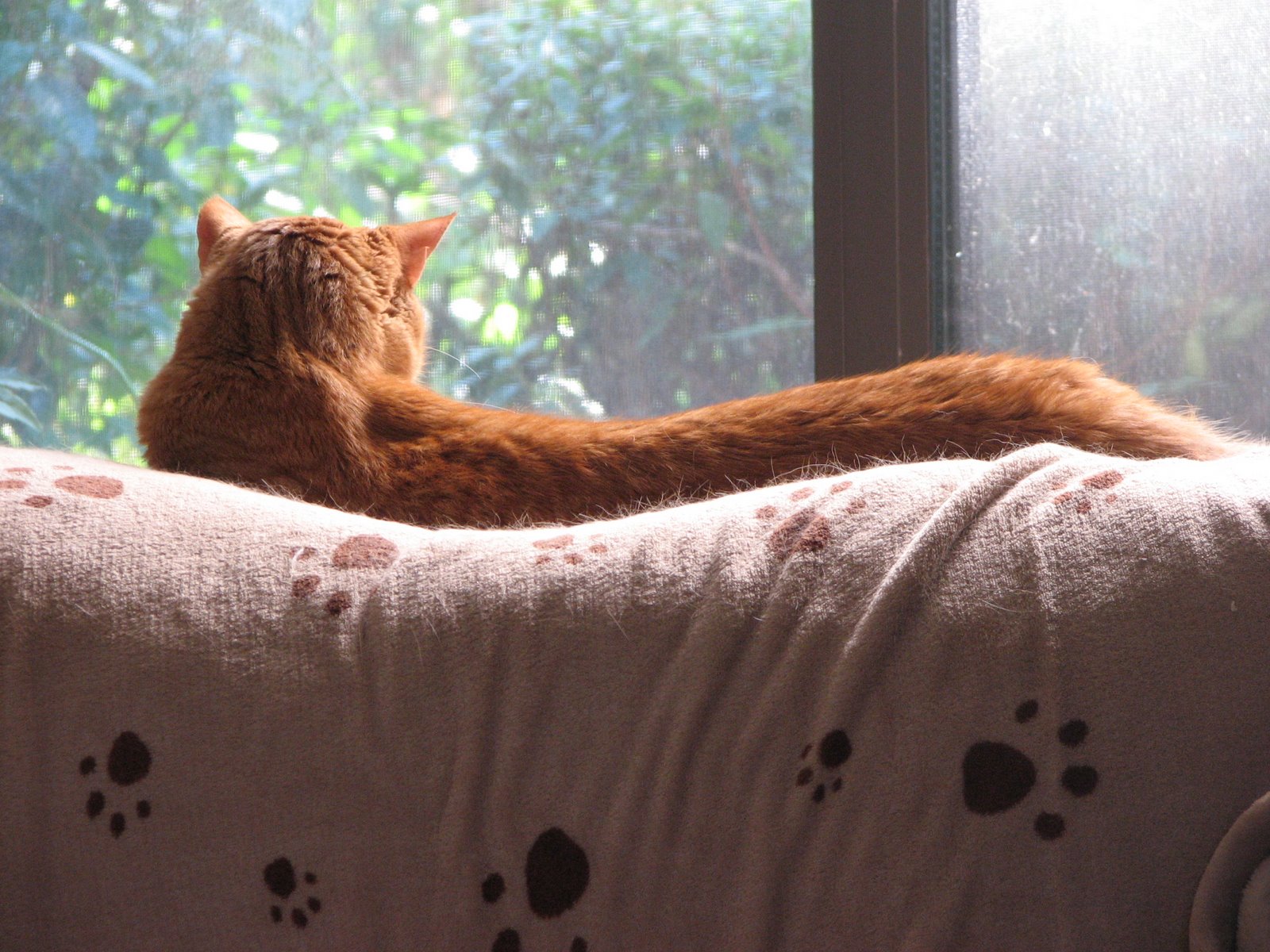 He has a morning ritual. He spends some time on the back porch, he goes back to the laundry room which usually has a window open and a ledge to sit on. Then after he is satisfied he will go to the back of his favorite chair and sleep there the rest of the day until dinner time and then he will rise and want to go back out again on the back screened in porch and if there's nothing there he's too interested in he will climb back up and sleep some more in his favorite spot. It's a good spot because as you can see he has a clear view to see out of and it's nice and sunny in the afternoon. Ahhhh what a life!
