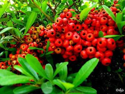 The pyracantha is full of red berries that the birds love to eat (but be careful there are 2" thorns all over this shrub and they bite...Mom calls this the piranha bush!)