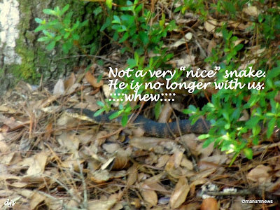 Sylvester is hustling over THIS MINUTE to go on snake watch and protect Gracie! He hardly ever blinks, so he'll spot a snake the second it appears. We get rattlesnakes, they are just as bad as cottonmouths. Your Dad is very brave to ded them. Did he use the Shovel Technique? That's what Mommy does. (Daddy is a softy)
