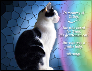 ReplyDeleteThat is a beautiful tribute. It is so very, very sad. It sounds like Cathy was a very special, loving person. We send purrs to Cathy's family and big purrs to Beau to comfort him in his Mom's absence. We purr his heart will heal and that he will find love again and adjust in his new living situation.