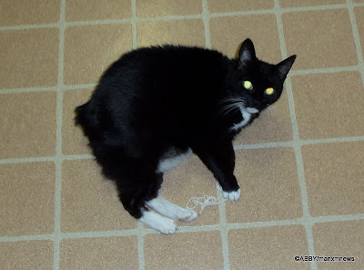 ReplyDeleteMy old Kitty loves her string too. She turns into her alterego "String-girl" every night at 10PM before we go to bed. She has to yawn exactly 3 times before she beings her attack on the string. Toby is 20 and has never really played with any other toys either. I got a big boot string for her after the vet told me tales of terror about all the zillions of kitties he has had to remove from kitties stomaches. Tell Abby to beware of the vicious string that can hop into her tummy - then the game is all over.Have you ever given her a twist tie from the bread bad and curled it around a pen. A few of my cats thought these were the best toy I ever gave them. Of course, you end up with hundreds of them under your refridgerator. Sometimes the cheapest things make the best toys.