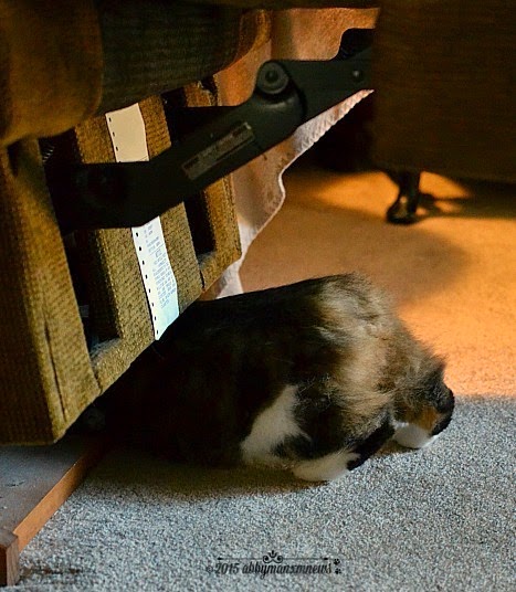 You have the cutest body, Annabelle! Annie likes to go under the recliner and also the reclining couch. We're very careful to not put the footrest down until we've looked to be sure it's all clear.