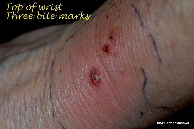 Last night after 9PM EST I was sitting with Abby in my lap giving her a good scritch in a place on her lower neck that she was enjoying when all of a sudden she seized a hold of my lower wrist and bit. Now this isn't unusual for her to be bitey, but in the past when she has 'bitten' it was more like a pinch, it would hurt but the skin would not be broken. She had my wrist in her mouth and she had her claws in me and I told her to let go and pulled back but not quickly. Well that got her all the more worked up and she attacked the top and bottom of my wrist with vigor and bit D-O-W-N and shook my wrist like it was food. She did this twice and she grabbed a hold again with her claws. After that it was all over. I mean this took all of 20 seconds if that. I was trying to minimize the damage without getting hurt, well I got hurt anyway. I mean it really hurt, and I'm sure any of you who have been bitten known what I'm saying. I went in and immediately cleaned up the wounds with alcohol and then some bedadine. But it really hurt through the night I could not stand anything to touch it. This morning when I got up it was swollen, inflamed and really hurting. So I called the doctor and they saw me right away. They all told me that anytime you have a cat bite seek medical attention. As you will see if you wish to look below at the two images my Doctor drew some lines around the two areas and said if the inflammation goes beyond that point GO TO THE ER! So she said she was putting me on some very strong antibiotics and I should see a decrease perhaps as early as tomorrow. So, I just wanted to let efurryone know that I will be a little slow on making many comments over the weekend. If you are squeamish do not look at the two pictures down below.
