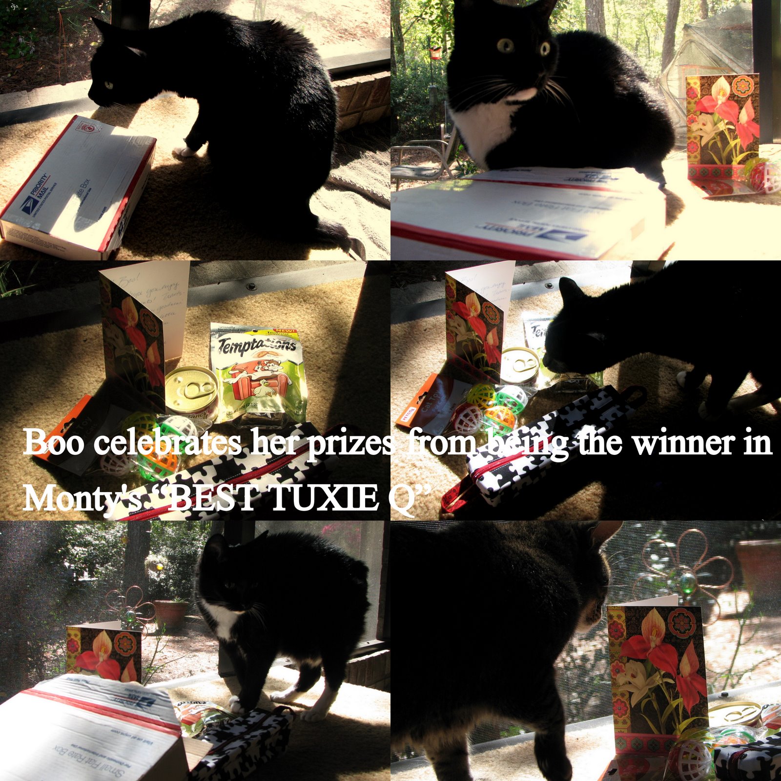 Miss Boo got a wonderful package of goodies for winning BEST TUXIE Q in Monty Q's contest. Miss Millie sponsored the BEST TUXIE category this year. Miss Boo wants to thank those that voted for her and also A BIG KITTY FANK YOU to both Millie & Monty!