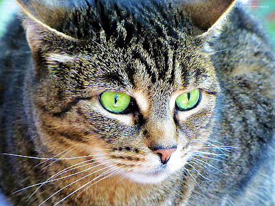 You can see I am sharing my mancat picture with Gracie. Gracie and I like to play together. We run and jump and swat at each other and have a really good time. But, while Gracie would like to continue to play I don't, so sometimes I have to forcibly tell Gracie to stop. I don't ever hurt her, in fact I would never hurt anyone (well except that squirrel if Mom would let me get out) I'm a lover not a fighter.