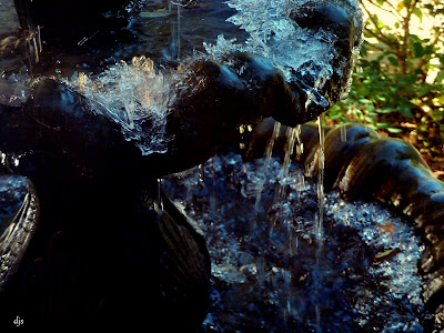 The fountain has frozen icy pieces in it.