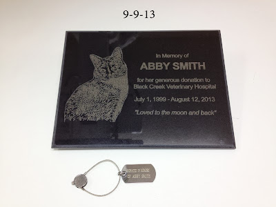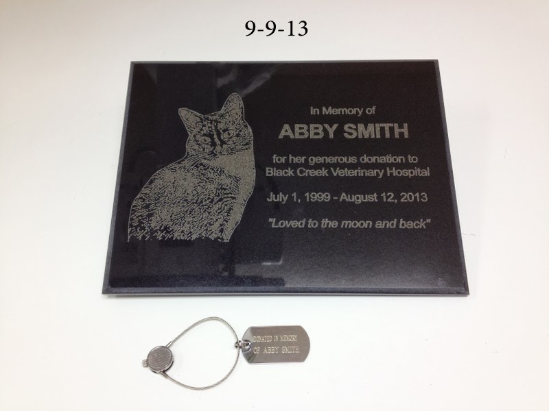 The day we took Abby on her final trip to the Vet on August 13,2013, we also brought her O2 tent to donate to the Veterinary Hospital. We had discovered that did not have one. So we wanted to do something to help any animal at our Vet practice that needed to be in an O2 tent.On that day we donated the tent that Abby herself no longer needed. Today our Vet called and said that they had the plaque done for the tent as a memorial to our girl. I am sitting here with tears.How beautiful it is. I am simply speechless.